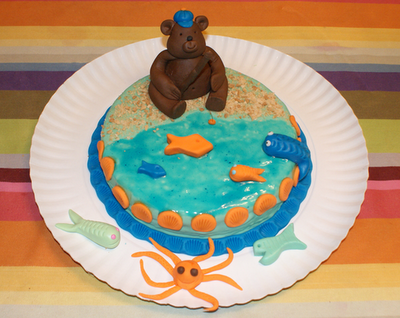 Estando o bolo coberto com a massa, passamos então à fase da decoração. Neste ponto, cada formada escolheu o tema do seu bolo, tendo como princípio que iríamos aprender a fazer um ursinho. Eu escolhi o tema do mar e decidi colocar o meu ursinho a pescar.