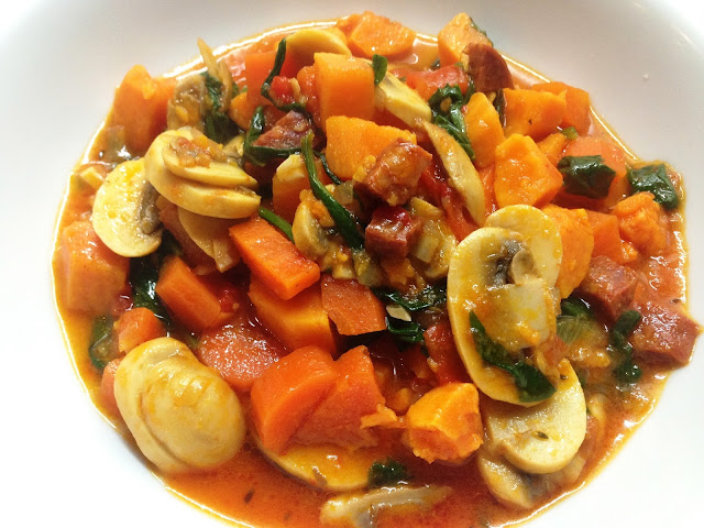 Arranjar as cenouras e cortar as mesmas às rodelas. Arranjar os cogumelos e laminar grosso, arranjando depois a batata e cortando-a em cubos. Picar as chalotas e o dente de alho e colocar tudo num tacho com azeite. Quando a cebola estiver ‘murcha’, adicionar o tomate, a linguiça e o vinho branco, deixando estufar em lume brando durante 2 minutos. De seguida, adicionar as cenouras, a batata-doce e os cogumelos. Temperar com sal. Depois, adicionar meia chávena de água quente e deixar estufar cerca de 20 minutos. Por fim, adicionar os espinafres, rectificar os temperos (se necessário) e deixar cozinhar durante mais 5 minutos.